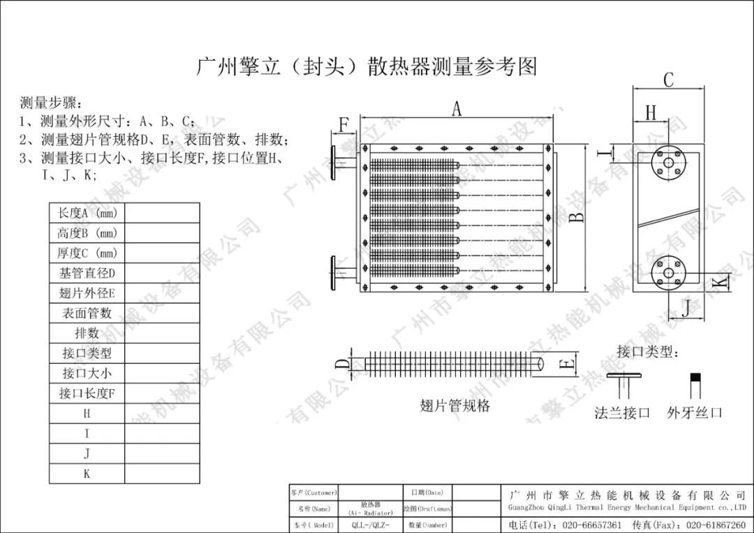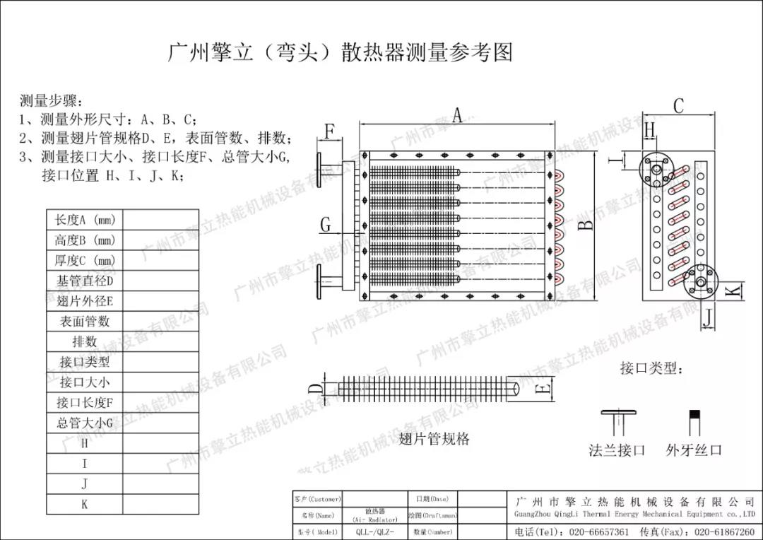 測量圖包含了長高厚位置示意,基管直徑、翅片外徑、表面管數(shù)、排數(shù)、接口類型大小,接口中心距,長度等~需要安裝孔位的還需要測量安裝孔位的大小,中心距等~